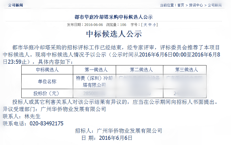 第三方網上公開冷卻塔招標信息: